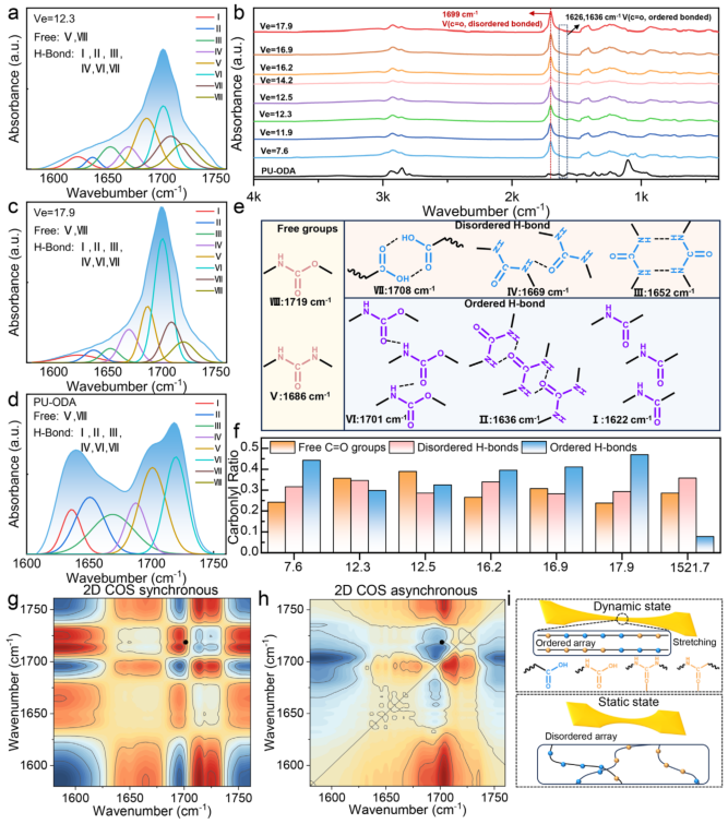 FT-IR光谱显示,PU-TA的羰基伸缩振动区存在八个子峰,对应有序/无序H键状态(图2a-d)。定量分析表明,PU-TA₃₀₀的H键化羰基比例最高(图2e)。动态拉伸实验通过二维相关FT-IR谱图证实:外力作用下,游离羰基转化为有序H键(图2g-i),分子链排列增强使氢键阵列有序化,显著提升能量耗散效率。