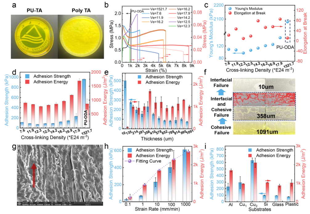 图3 PU-TA与PU-ODA弹性体性能表征 a) PU-TA与聚硫辛酸的结构示意图。 b) 无缺口样品的拉伸应力-应变曲线。 c) 不同Ve下的断裂伸长率与杨氏模量。 d) 粘附性能随Ve的变化。 e) 不同厚度样品的粘附性能。 f) 不同厚度下的断裂行为。 g) 铝基板上358 μm厚PU-TA的SEM图像。 h) 不同应变速率下的粘附性能。 i) 不同基板上的粘附性能。