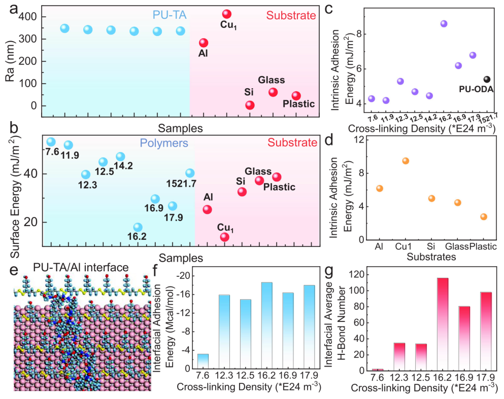 图4 PU-TA弹性体与基板的界面韧性 a) 基板与PU-TA的表面粗糙度。 b) 表面能对比。 c) 不同Ve样品在铝基板上的本征粘附能。 d) PU-TA₃₀₀在不同基板上的本征粘附能。 e) PU-TA在铝基板上的构象。 f) 铝基板上的界面粘附能。 g) 界面平均氢键数量。