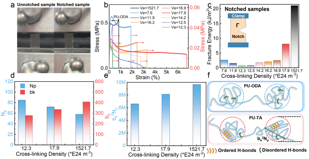 图5 PU-TA弹性体的本体能量耗散 a) 无缺口/缺口样品示意图。 b) 缺口样品的拉伸曲线。 c) 不同交联密度下的断裂能。 d) 库恩长度与库恩数量。 e) 端到端均方距离。 f) 端到端距离示意图。