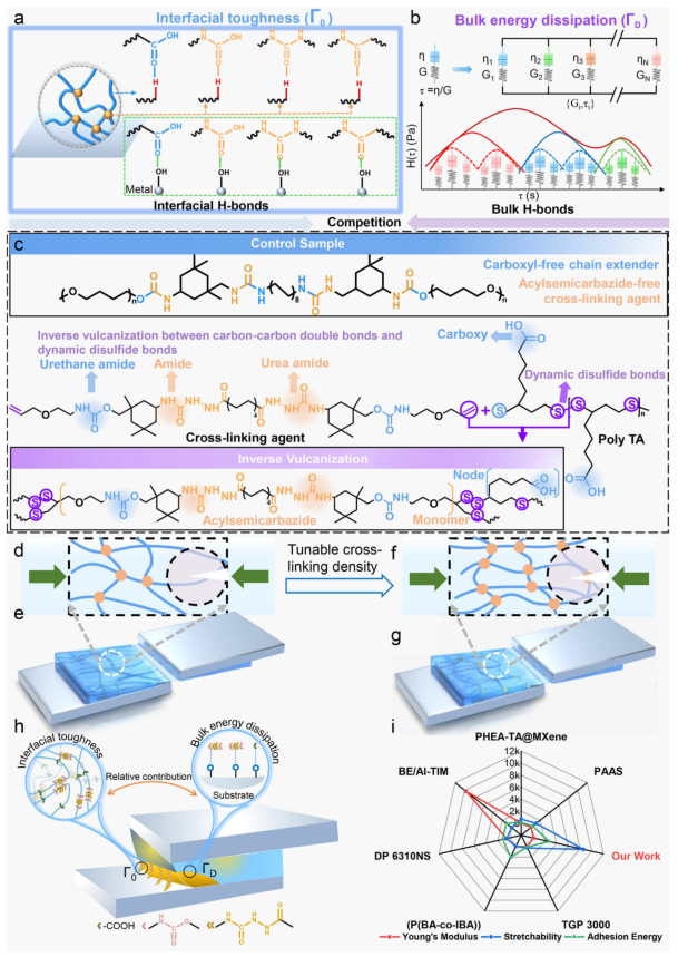 图1 基于分子工程的PU-TA弹性体设计原理 a) 本体能量耗散:麦克斯韦单元由弹簧和缓冲器组成;松弛谱H(τ)包含一系列弹簧刚度和弛豫时间。 b) 界面韧性:PU-TA分子结构含多重氢键;弹性体与金属原子羟基形成界面氢键。 c) 化学交联剂与扩链剂结构。 d-g) 不同Ve下PU-TA的链网络示意图及裂纹尖端过程区;搭接剪切测试中的内聚失效模式。 h) 剪切测试中界面韧性(Γ₀)与本体耗散(Γb)示意图。 i) PU-TA与代表性粘附材料的粘附能-杨氏模量-拉伸率对比。