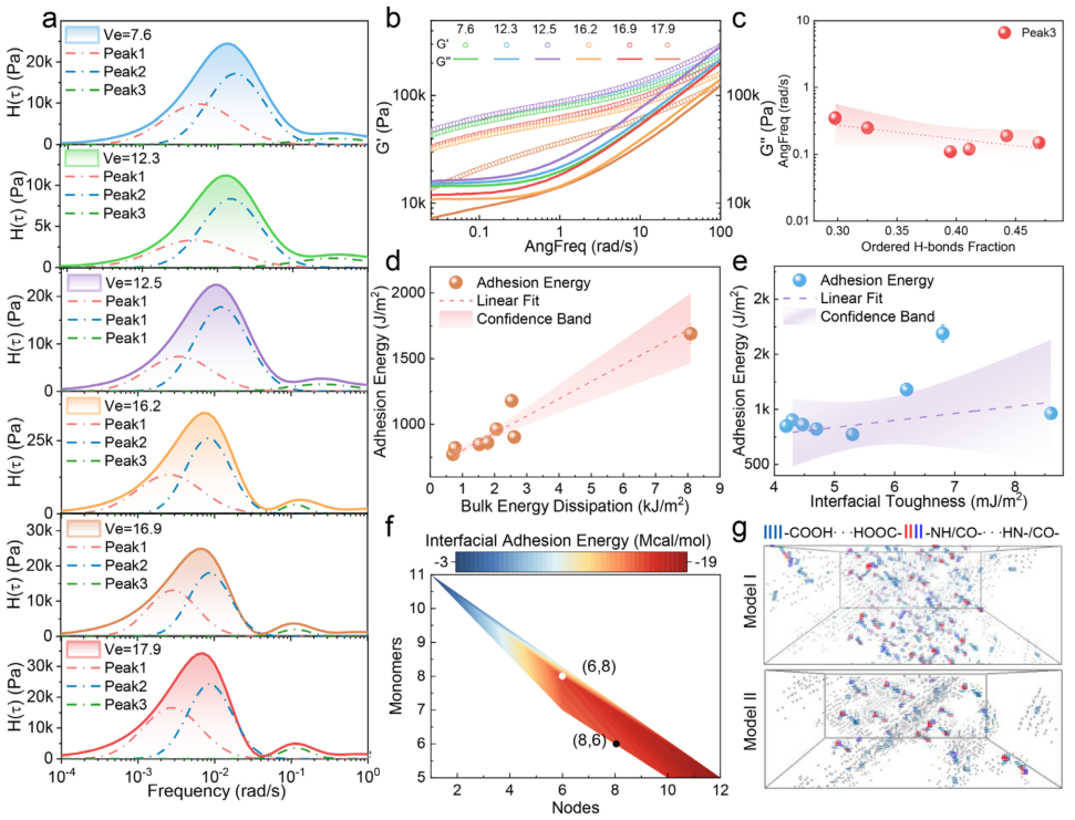 松弛谱H(τ)分析发现,有序H键比例与特征峰频率呈负相关(图6c),直接关联本体耗散强度。线性拟合证实:粘附能与本体耗散的相关系数(0.9)远高于界面韧性(0.4),且本体耗散贡献量级比界面韧性高六倍(图6d-e)。分子模拟进一步显示,羧基和脲酰胺形成的密集H键网络(模型I)是高效能量耗散的基础(图6g)。