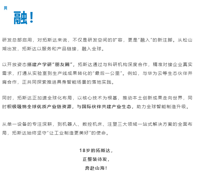 核心提示:官宣!拓斯达全球研发总部基地正式启用
